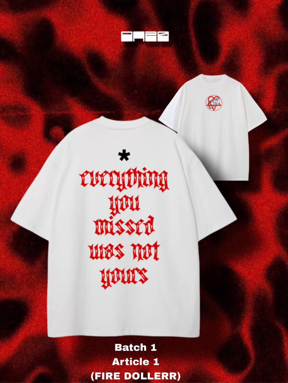 A crisp, bold statement piece. The Fire Dollerr tee carries the message “Everything you missed was not yours” in striking red gothic font, paired with a symbolic chest emblem. Clean, meaningful, and impactful — a perfect mix of comfort and attitude.